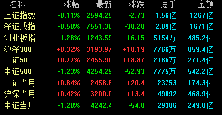 【香港商报网讯】A股三大股指今日全线走弱,其中沪指收盘下跌0.11%,收报2594.25点;深成指下跌0.50%,收报7551.30点;创业板指下跌1.28%,收报1243.59点。市场成交量依然低迷,两市合计成交2938亿元,行业板块多数收跌,黄金板块领跌。