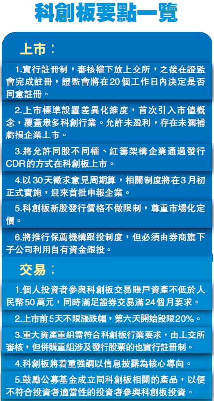 【香港商報网訊】中國證監會昨天正式發布《關於在上海證券交易所設立科創板並試點註冊制的實施意見》(以下簡稱《實施意見》),這意味着外界期待的科創板和註冊制試點正式到來。隨後中證監又發布監管辦法,明確符合要求的虧損、紅籌企業可在科創板上市,投資者門檻限定在50萬資金以上,且有兩年投資經驗。
