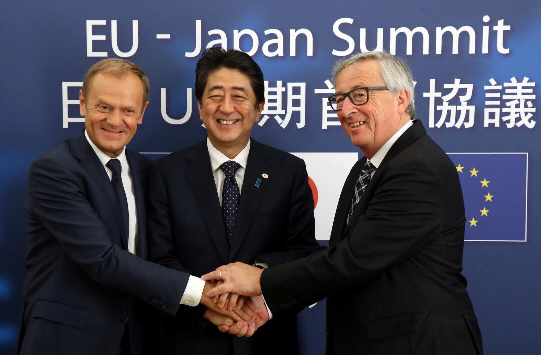 2018年7月17日,歐盟理事會主席圖斯克(左)、歐盟委員會主席容克(右)與日本首相安倍晉三在東京簽署《歐日經濟夥伴關係協定》(EPA)。
