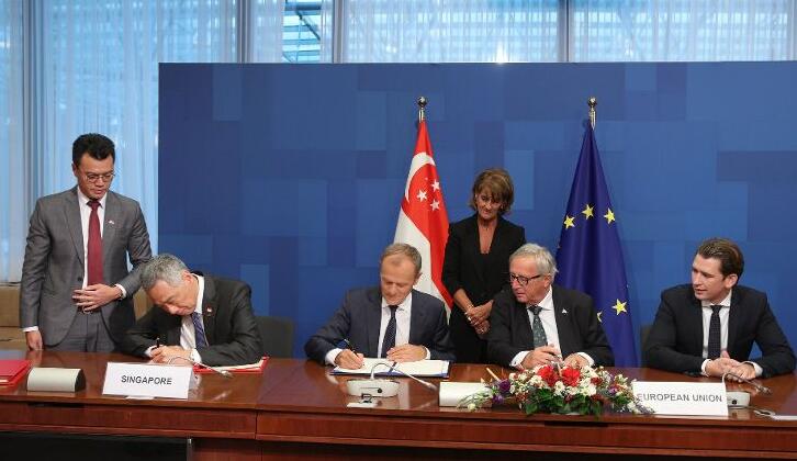 10月19日,歐盟與新加坡簽署歐盟-新加坡自貿協定(EUSFTA)。EUSFTA生效後,84%的新加坡貨品進口到歐盟國家時將豁免關稅,而協定生效的3至5年內,所有進口到歐盟的新加坡產品將實現關稅全免。據估算,兩個經濟體的雙邊貿易也將因該協定進一步擴大,預計5年可增長10%。新加坡總理李顯龍將EUSFTA形容為「高素質協議」,並表示該協議在貿易保護主義抬頭的背景下,起?「高舉自由貿易旗幟」的引領作用。歐盟委員會主席容克也表示:「簽署該協定傳達了一個強有力的信息,即達成一致的夥伴們捍衛以法規、合作和多邊主義為基礎的國際體系。」
