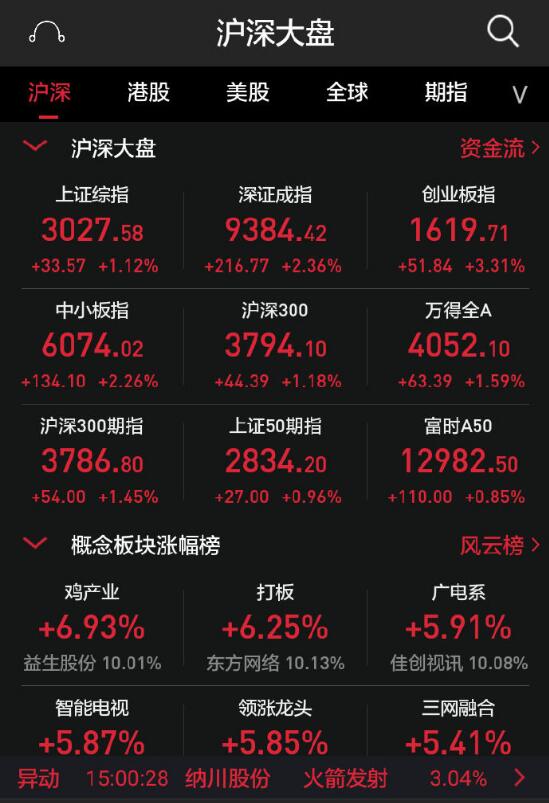 从盘面上看,行业板块全线上涨,视听器材、养殖业、通信服务居板块涨幅榜前列。