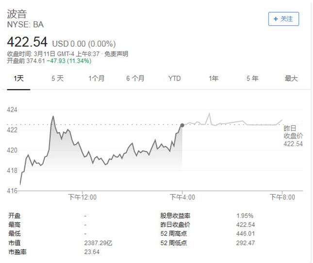 纽约证券交易所波音开盘前股价跌至374.61点。