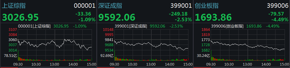 截止收盘,沪指跌1.09%,深成指跌2.54%,创业板指跌4.47%。此外,沪深两市成交额连续两天突破一万亿。