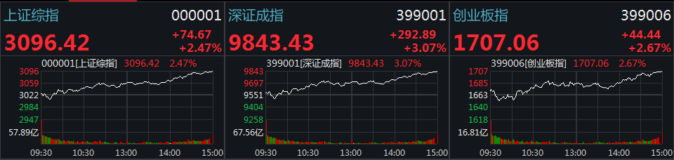 截止收盘,沪指上涨2.47%,逼近3100点,深成指上涨3.07%,创业板指上涨2.67%。两市合计成交8330亿元,行业板块全线上扬,酿酒板块集体爆发,两市近百股涨停。