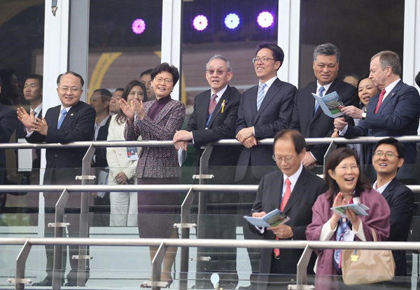 林鄭月娥(後排左二)、張曉明(後排右三)、馬興瑞(後排右二)及王志民(後排左一)由周永健(後排左三)和應家柏(後排右一)陪同下觀賞賽事。 記者 陳志誠攝
