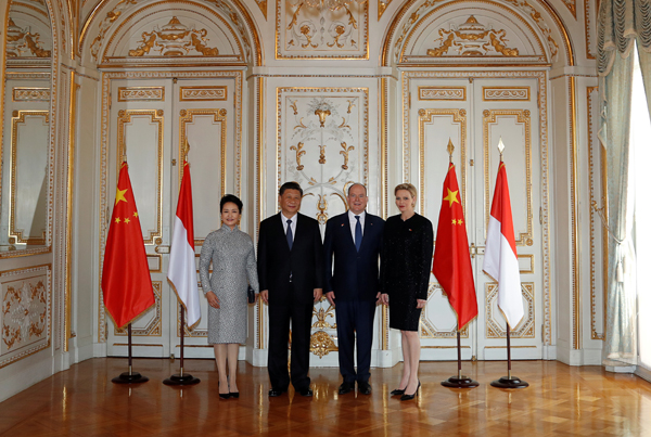 當天,國家主席習近平同摩納哥親王阿爾貝二世舉行會談。習近平指出,很高興應親王殿下邀請對摩納哥公國進行國事訪問。這是中國國家主席首次訪問摩納哥。我們兩國相似的民族性格和共同的精神追求,使得我們相知相親。中摩建交20多年來,雙方始終真誠友好、平等相待。當前,中摩雙邊關係穩步發展,務實合作與時俱進,尤其是在環保、電信、移動支付等新領域走在中歐合作前列。中摩關係已成為不同大小、不同歷史文化、不同社會制度國家友好交往的典範。