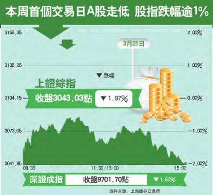 【香港商報网訊】受外圍市場下跌影響,本周首個交易日A股走低,四大股指跌幅均逾1%。其中,上證綜指跌近2%,失守3100點關口。