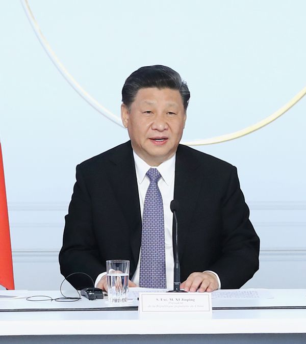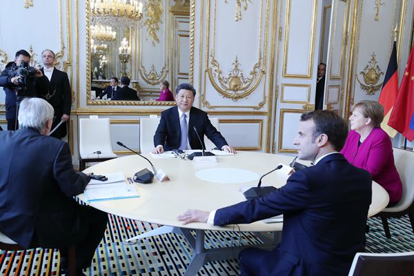 3月26日,国家主席习近平在巴黎同出席中法全球治理论坛闭幕式的法国总统马克龙、德国总理默克尔和欧盟委员会主席容克举行会晤。新华社