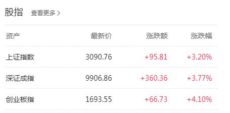 【香港商报网讯】今日两市小幅高开后,早盘在券商、军工股走强带动下,三大股指全线上涨;午后地产股发力,各大股指涨幅进一步扩大,尾盘工业大麻板块反弹拉升,沪指涨幅继续扩大涨逾3%,向3100点发起冲击,创指大涨超4%,行业板块几乎全线上涨,做多资金显著增强,市场人气集聚回升。截止收盘,沪指报3090.76点,涨3.20%,,成交额3867亿,2019年一季度上涨23.93%;深成指报9906.86点,涨3.77%,成交额4495.8亿;创指报1693.55点,涨4.10%,成交额1222亿。两市合计成交8362.85亿元,较上一交易日的6636.63明显放量。