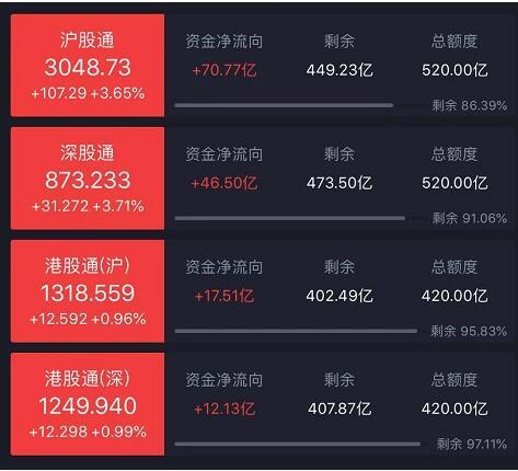 资金流向方面,北向资金今日净流入117.44亿元,创4个月以来新高买入记录。其中,沪股通净买入70.77亿元,深股通买入46.67亿元。