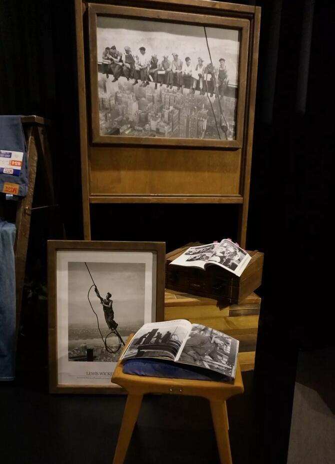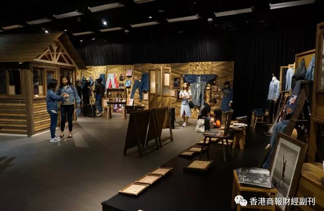 展覽場地以黑牆及木架設計,兩邊的木板上擺放了眾多牛仔褲展品,中間更設一間小木屋。