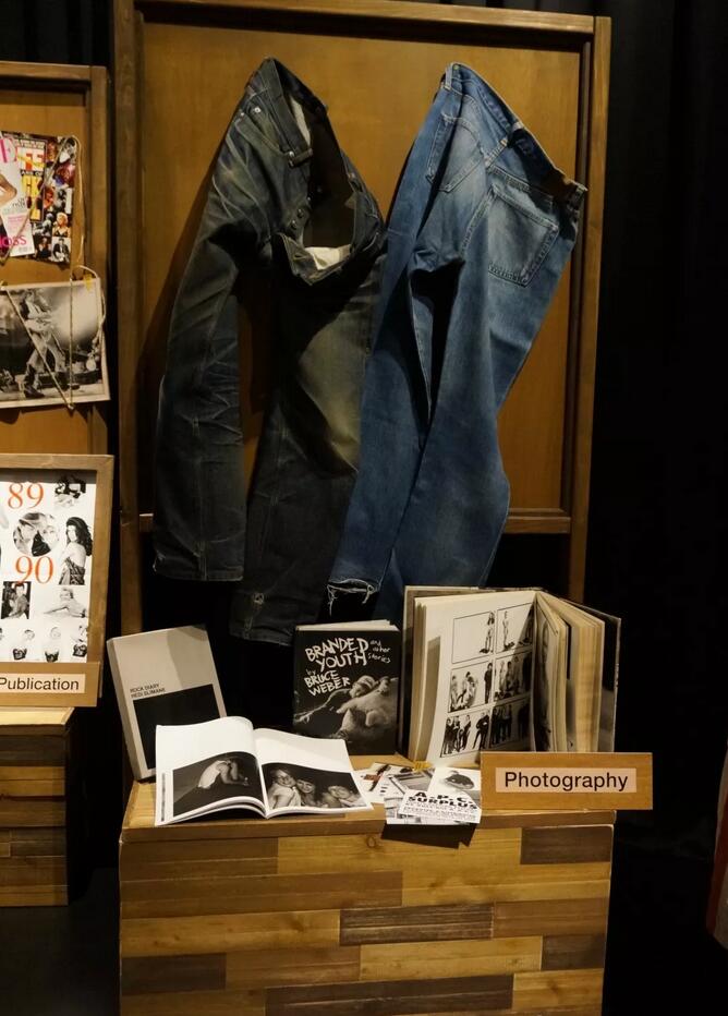 牛仔服貫穿日常生活展覽分為四個部分,第一部分介紹牛仔服如何由電影、攝影、藝術與音樂、雜誌出版界和廣告創作五方面融入我們的生活。展品是策展人黃源順及程少偉的藏品,包括《號外牛仔褲百科全書》、Calvin Klein Jeans 1992年廣告照片、本地品牌 YORK廣告等,都是他們在工作上接觸到而累積下來與牛仔服相關的藏品。黃源順更展出珍藏的法國A.P.C.牛仔褲,他向本報記者透露:「它原本是深藍色的,被我穿了20年已經長了鬚,穿上身非常舒服,整個人的心情也會很好。」言語間透露出對它的熱愛,為了保存牛仔褲,黃源順一年只會用水把它浸泡幾次,已成為充滿皺紋的老朋友。