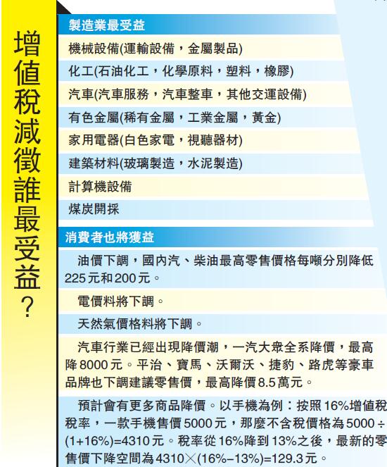 「此次增值稅改革減稅規模預計在7000億元至8000億元之間。根據我們測算,將製造業等行業現行16%稅率降至13%,平均會增厚淨利潤8.01%,將交通運輸業、建築業等行業現行10%稅率降至9%,平均會增厚淨利潤3.3%。」潘向東說,採掘、商貿、化工、計算機、紡織服裝、通信行業將是增值稅減稅最大受益者,其中化工、採掘、建築裝飾、醫藥生物、汽車製造業實際減稅規模都超過百億。整體顯示,增值稅減稅對上游製造企業利潤增厚幅度最為明顯,採掘和化工淨利潤增厚幅度達到13.99%和10.95%,下游的食品飲料、汽車製造等受益影響較弱,淨利潤增厚幅度分別為6.03%、6.9%。