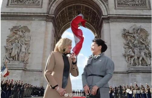 凯旋门下举行欢迎仪式很罕见。许多民众为了一睹盛况,寒风凛冽仍坚持全程观礼。