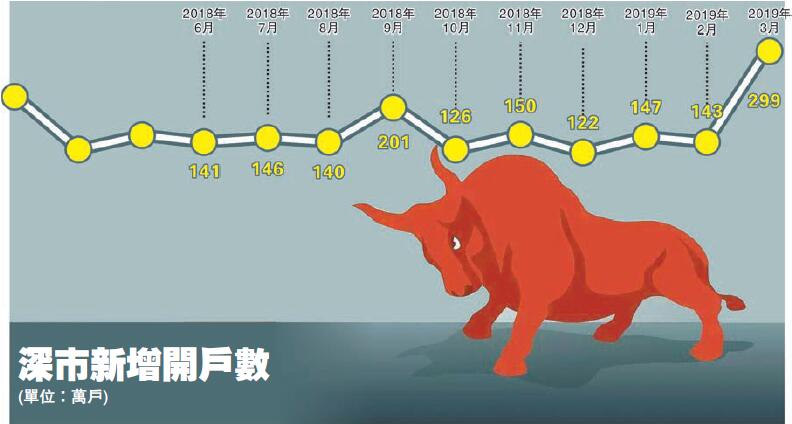 散戶入市也在加速,深交所最新公布的數據顯示,3月份深市新增開戶數近300萬,環比激增一倍,交易戶數也增加三成多。有券商櫃台人士表示,近來新開戶的人的確不少,以往開戶資料前後端審核最多等幾分鐘,現在要等半個小時,「還有一些激活休眠賬戶的人也不少」。