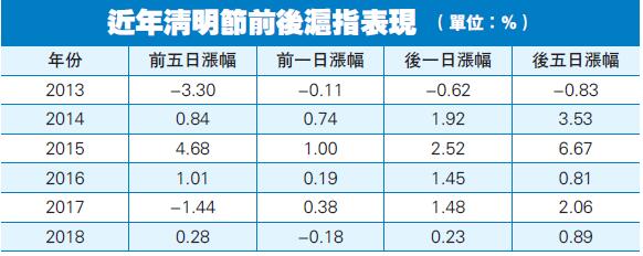 對於後市,外界普遍預期上漲概率大。統計也顯示,2008年以來歷年清明前後市場大概率走好。2008年-2018年這11年的表現中,清明節前一日有8次上漲,3次下跌,清明節後有10次上漲、1次下跌;進一步統計,過去11年中不僅清明節後首日大概率上漲,節後五日滬指上漲的也有9次,下跌的僅2次。