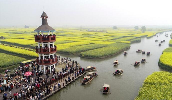 4月7日,游客在江苏兴化千垛景区游览(无人机拍摄)。新华社