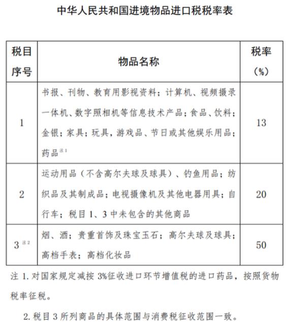 国务院关税税则委员会发布关于调整进境物品进口税有关问题的通知。将进境物品进口税税目1、2的税率分别调降为13%、20%。将税目1“药品”注释修改为“对国家规定减按3%征收进口环节增值税的进口药品,按照货物税率征税”。上述调整自2019年4月9日起实施。