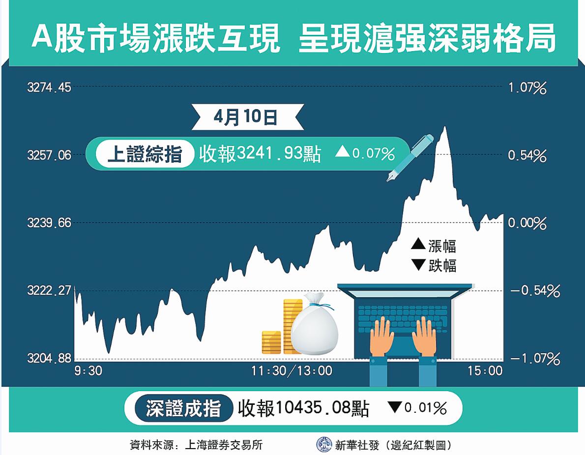 【又訊】4月10日,滬指低開上行,尾盤衝高回落,驚險收紅。截至當日下午收盤,上證綜指報收3241.93點,上漲0.07%;深證成指報收10435.08點,下跌0.01%;創業板指報收1726.64點,下跌0.83%。