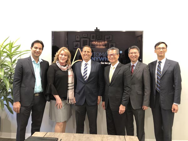 陳茂波當地早上先與Automation Anywhere的管理層討論人工智能及自動化的最新發展趨勢。該公司是從事機械人流程自動化軟件開發業務,在全球多個城市設立辦公室,協助各行業透過自動化改善營運效率。