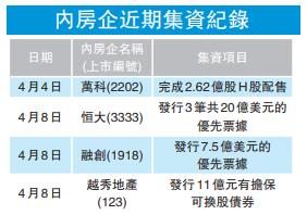 無獨有偶,同一日融創(1918)亦宣傳發行2023年10月到期的7.5億美元7.95%優先票據,越秀地產(123) 亦擬發行於2020年到期之11億元1.875%有擔保可換股債券。再加上早前萬科企業(2202)折讓約5%完成2.62億股新H股配售,以及碧桂園(2007)、正榮地產(6158)、佳兆業(1638)等紛紛發債籌資,短期內這些上市房企合共所發布的融資計劃總金額已過千億元!