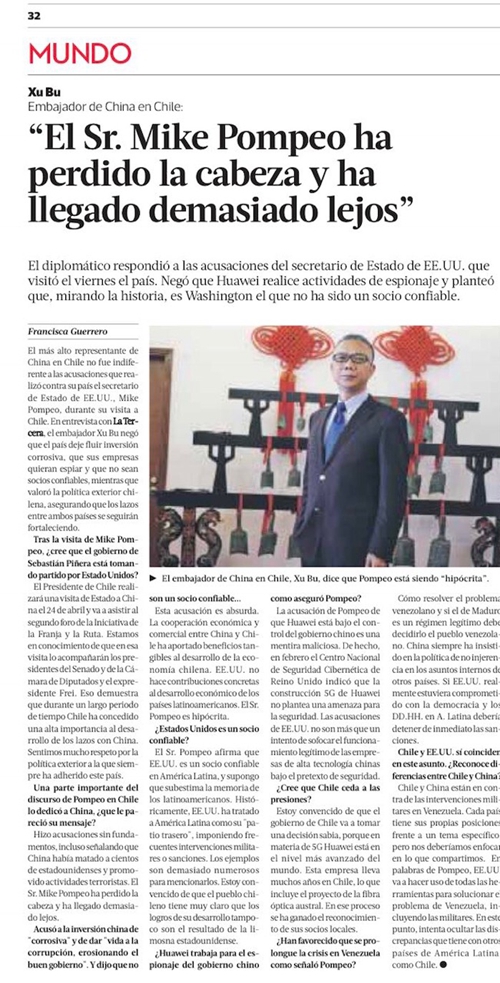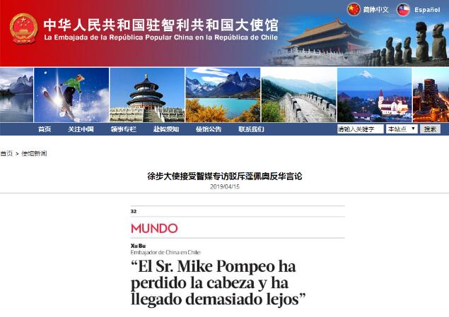 2019年4月14日,智利主流媒体《三点钟报》纸版和网络版同时刊登对徐步大使专访,标题为《蓬佩奥已经失去理智且走得太远》。4月13日,《三点钟报》记者弗朗西斯卡·格蕾罗在使馆采访徐大使。针对美国务卿蓬佩奥4月12日访问智利期间对中国进行大肆恶毒攻击,徐大使在专访中予以有理、有据、有力的驳斥。专访全文翻译如下: