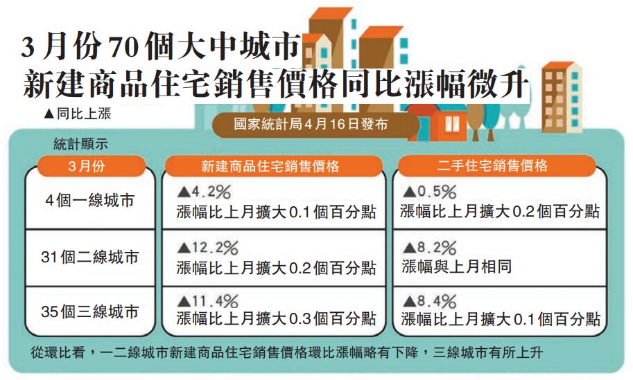 根據國家統計局的數據,今年3月, 四個一線城市新建商品住宅銷售價格環比上漲0.2%,漲幅比上月回落0.1個百分點。但二手住宅銷售價格環比上漲0.3%,漲幅比上月擴大0.2個百分點。其中,北京、上海和深圳分別上漲0.4%、0.3%和0.7%,廣州下降0.5%。31個二線城市新建商品住宅銷售價格環比上漲0.6%,漲幅比上月降低0.1個百分點;二手住宅銷售價格環比上漲1.2%,上月為下降0.2%。35個三線城市新建商品住宅銷售價格環比上漲0.7%,漲幅比上月擴大0.3個百分點;二手住宅銷售價格上漲0.5%,漲幅比上月擴大0.3個百分點。