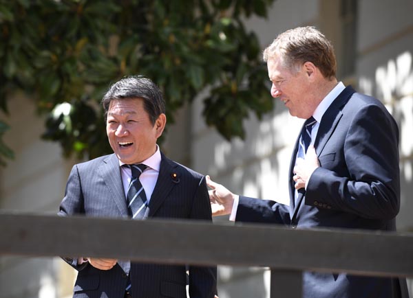 美國貿易代表萊特希澤(右)與日方談判代表、經濟再生擔當大臣茂木敏充在USTR合影。 新華社