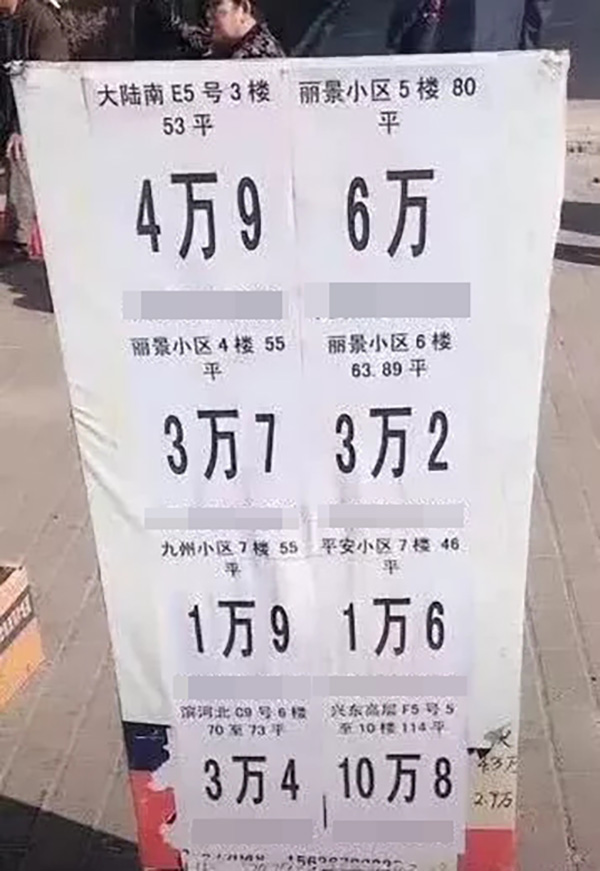 有媒体曝出一组房价图,在鹤岗,一套53平方米的两室一厅只卖2.9万元(注意,是每套不是每平方米);某70平方米的房子标价1.9万元;某建于2019年的新房,三室一厅180平方米,标价9万元,计500元每平方米。