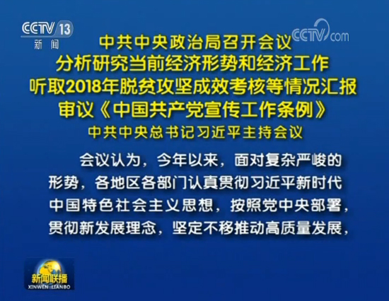 【香港商報网訊】據新華社報道,中共中央政治局4月19日召開會議,分析研究當前經濟形勢,部署當前經濟工作;聽取2018年脫貧攻堅成效考核等情況匯報,對打好脫貧攻堅戰提出要求;審議《中國共產黨宣傳工作條例》。中共中央總書記習近平主持會議。
