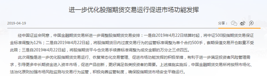一是自2019年4月22日结算时起,将中证500股指期货交易保证金标准调整为12%;