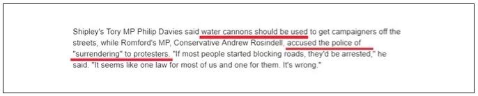 但多位英国政客还嫌警方不够卖力,要求动用高压水炮等手段直接将拒绝离开交通干道的抗议者驱赶出去。