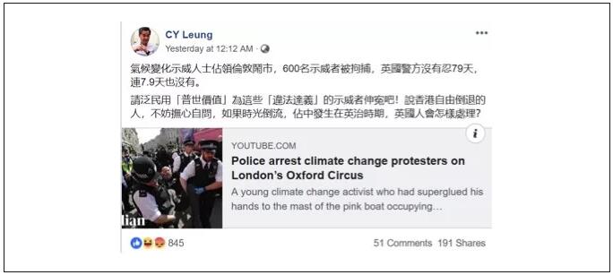 香港前特首梁振英就在个人社交账号上发帖说:“气候变化示威人士占领伦敦闹市,600名示威者被拘捕,英国警方没有忍79天,连7.9天也没有……说香港自由倒退的人,不妨抚心自问,如果时光倒流,占中发生在英治时期,英国人会怎样处理?”