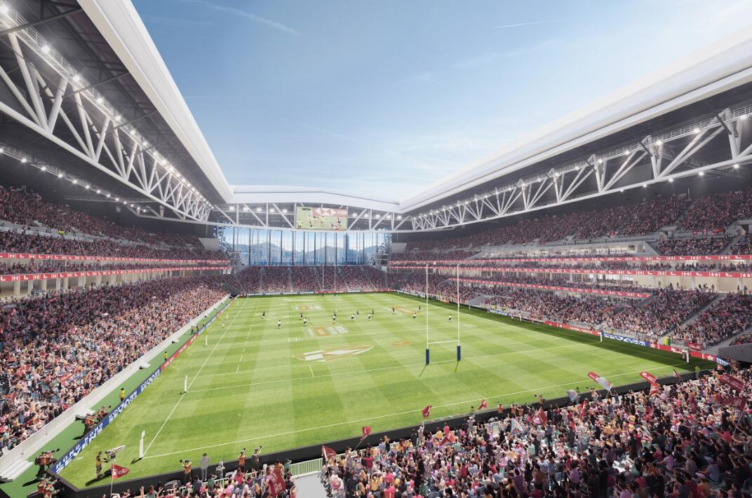 啟德體育園主場館模擬圖,南看台玻璃幕牆透視維港美景。