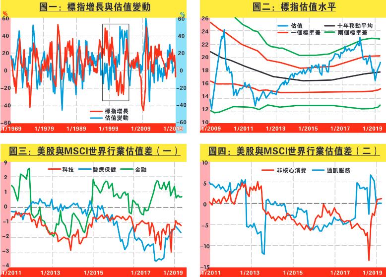 最直接可看估值。參考標指過往50年的數據,圖一可見其按年增長與市盈率變動大致同向,唯獨科網股爆破時盈利急速下滑(黑框),幅度更大於每股市價,導致估值暴升,因此兩者走勢一度背離。然而近幾年標指增長與市盈率變動走勢合,因此初步估計目前估值可算是合理。