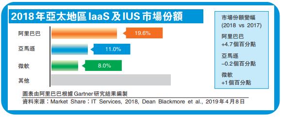 報告指出,阿里雲2018年在亞太地區佔有19.6%的市場份額,較2017年上升4.7%。第二位及第三位的供應商分別為佔11%市場份額的亞馬遜,以及佔8%的微軟。