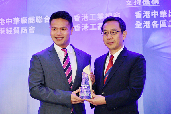朱鼎健(左)從中聯辦青年工作部部長陳林手中接過獎座。