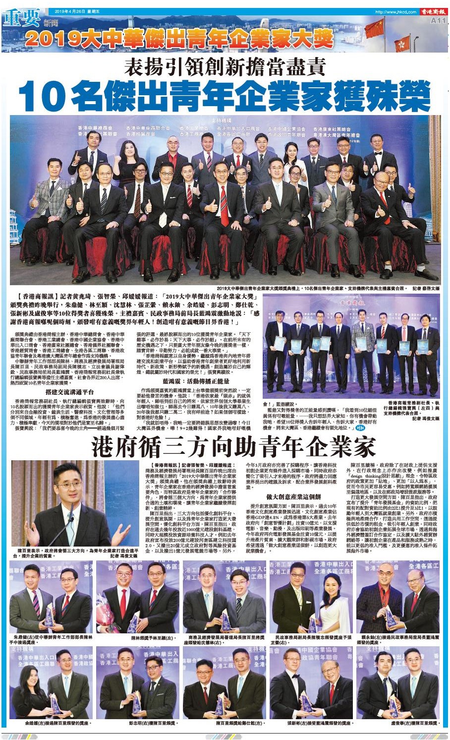 商務及經濟發展局署理局長陳百里昨晚出席由香港商報主辦的「2019大中華傑出青年企業家大獎」頒獎典禮。他在頒獎典禮上致辭時表示,青年企業家在香港的經濟發展中擔當重要角色,而特區政府是青年企業家的「合作夥伴」,將會循三個大方向,為青年企業家提供合適的土壤和環境,讓青年企業家繼續發揮創新、創業精神。