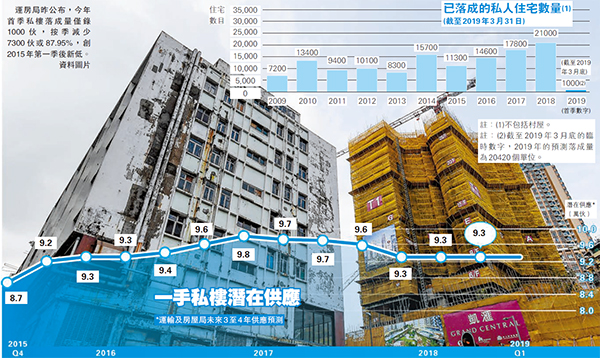 首季已落成的貨尾單位500伙,首季私人住宅施工量為2300伙,按年少3300伙或58.92%;按季則增加300伙或15%。運房局料未來3至4年一手私人住宅單位數量維持在9.3萬伙,當中包括9000個貨尾單位、6.2萬伙興建中但未售出單位、2.2萬個在已批出土地(熟地)上可隨時動工興建的單位。