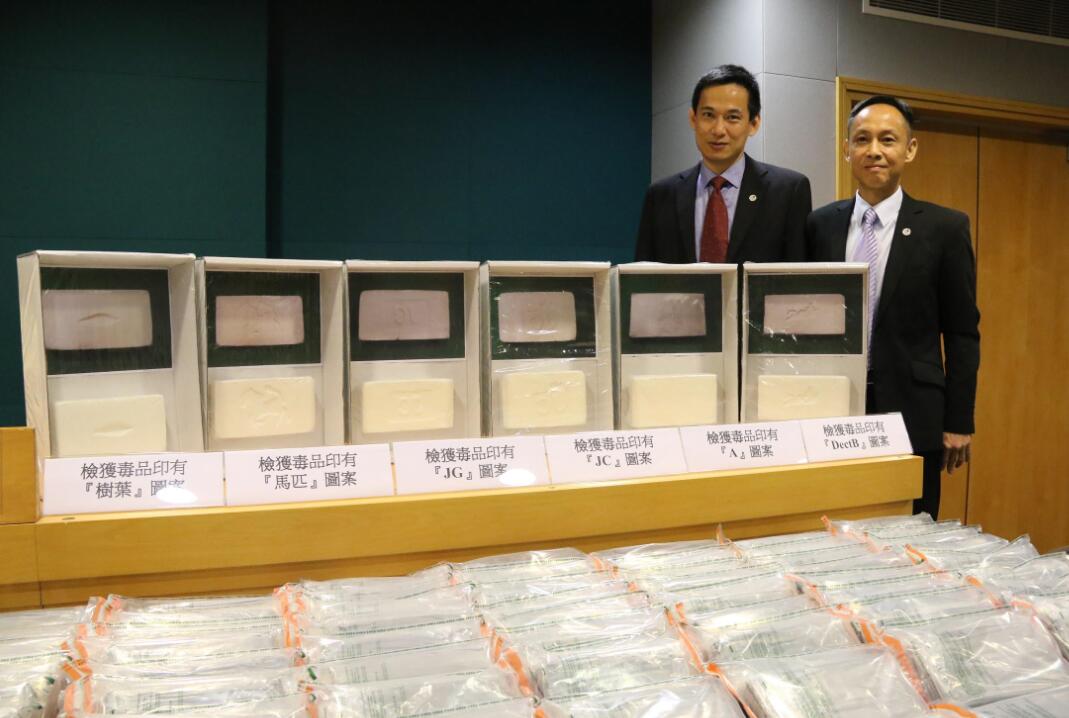 許偉明(右)及葉國樑講述販毒集團犯案手法,及展示檢獲大批毒品。