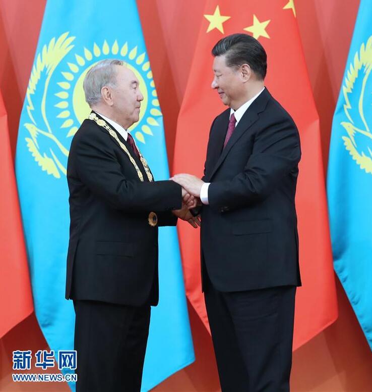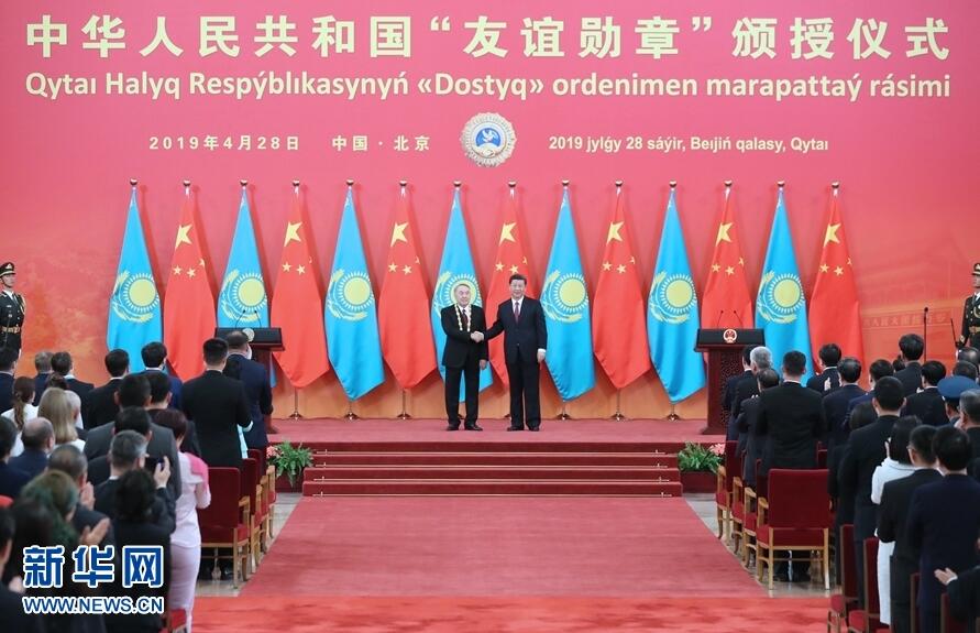 纳扎尔巴耶夫致答辞。纳扎尔巴耶夫表示,非常感谢习近平主席今天向我颁授中华人民共和国“友谊勋章”,这对我是无上荣誉。这枚勋章反映了中方对我致力于推进哈中全面战略伙伴关系努力的高度认可。哈中在相互尊重和相互信任基础上建立起的友好关系已经成为国与国关系的典范,两国间没有任何未决问题。我同中国领导人之间的深厚友谊和互信将永远留在我心里。我衷心祝贺中国成功举办第二届“一带一路”国际合作高峰论坛。习近平主席提出的“一带一路”倡议,已经成为成功的国际合作平台,不仅推动了亚欧大陆的共同发展,也促进了世界的和平与繁荣。在中华人民共和国成立70周年之际,我衷心祝愿中国人民在以习近平同志为核心的中国共产党领导下,顺利实现中华民族伟大复兴的中国梦。中国的发展繁荣对世界是重大利好。