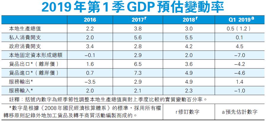 昨日,特區政府公布本港第一季經濟生產總值預估數字──首季按年實質增長0.5%,去年第四季增長為1.2%。不過,經季節性調整而作相連季度比較,本港經濟第一季較去年第四季實質上升1.2%,即本港經濟按季有所反彈。