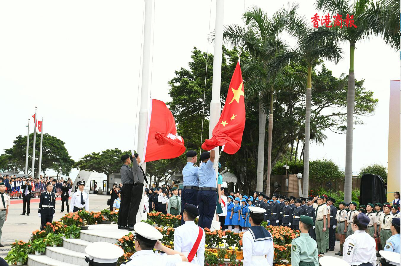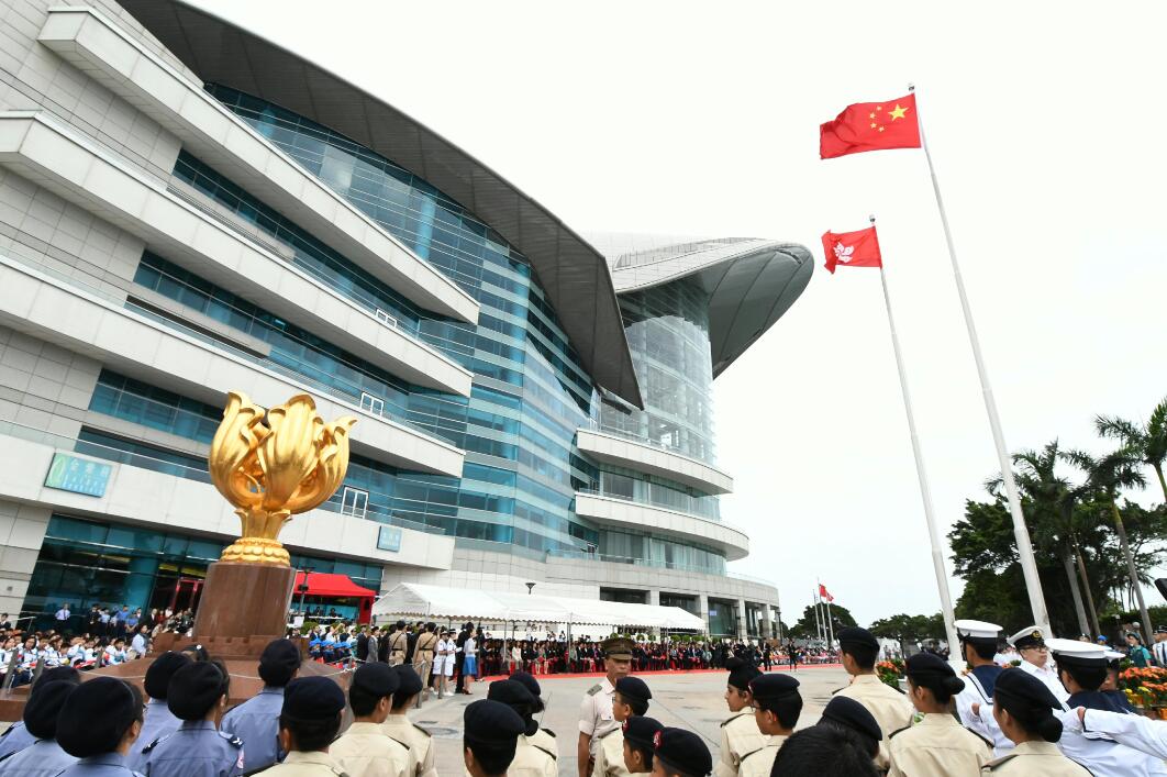 8時左右,在香港兒童合唱團領唱的國歌聲中,全體人員肅立,兩名青少年升旗手將國旗和香港特別行政區區旗冉冉升起,五星紅旗和紫荊花旗在空中飄揚。