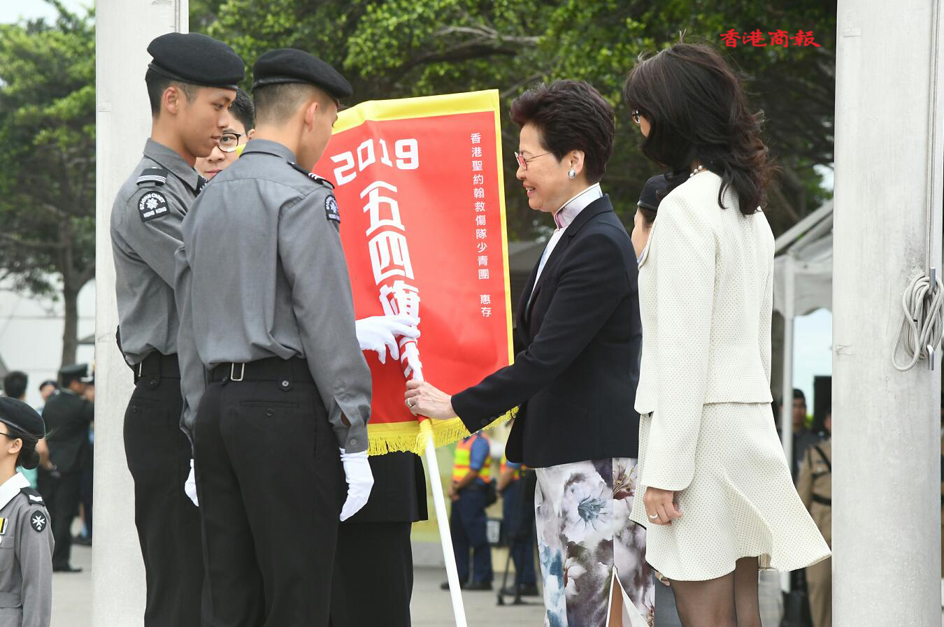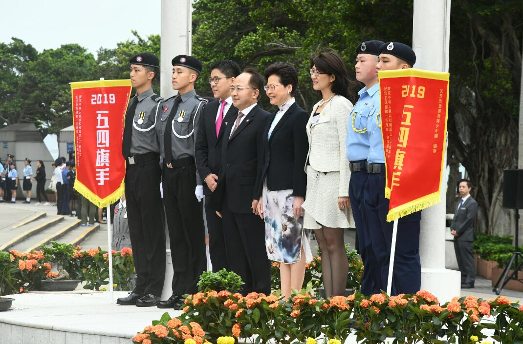 今年共有16隊青少年制服團體參加升旗活動,包括制服團體代表宣讀《五四宣言》及頒發「五四旗手」榮譽儀式。已獲選升旗儀式的4名「五四旗手」,從旗手選拔賽中脫穎而出,他們分別來自民眾安全服務隊少年團及香港聖約翰救傷隊少青團。林鄭月娥、王志民等向擔任本次升旗儀式的兩名升旗手和兩名持旗手頒發「五四旗手」榮譽旗。