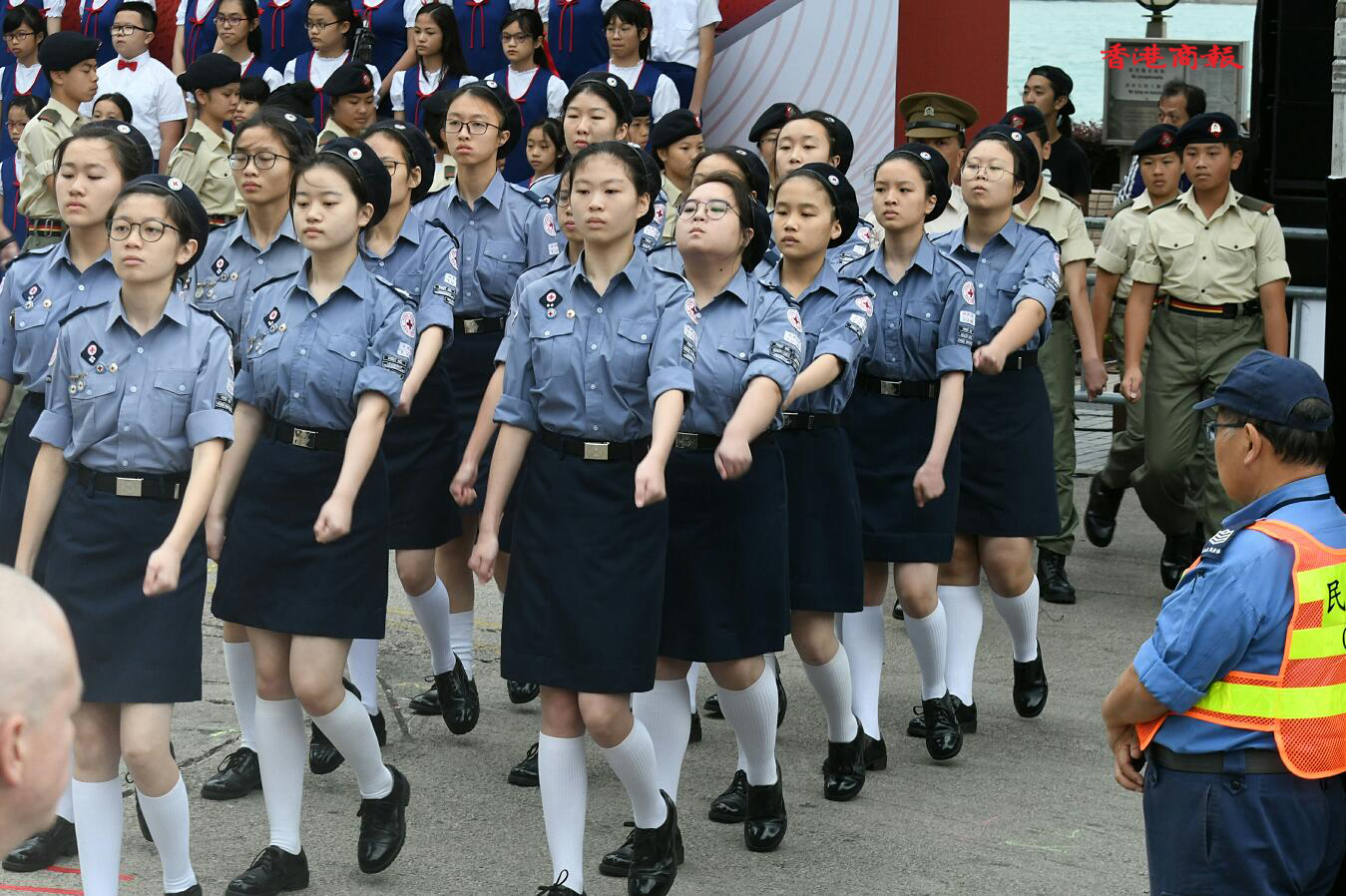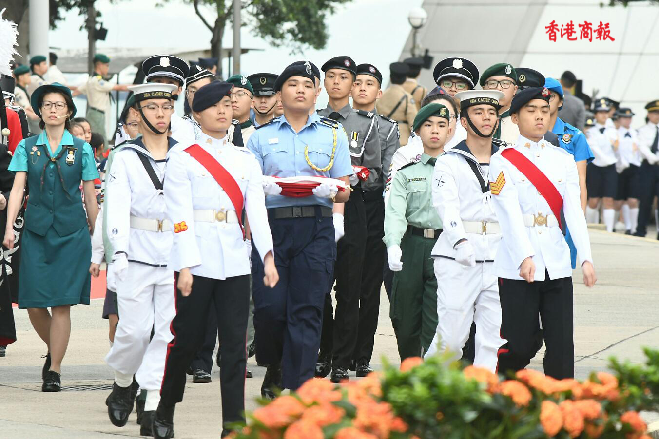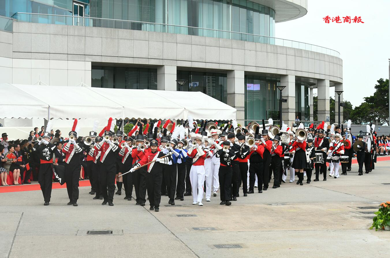 早上7時50分,伴隨着悠揚的軍樂和指揮官的口令,由香港紅十字青少年團、香港少年領袖團、香港青少年軍總會等青少年制服團體組成的儀仗隊、護旗隊及升旗隊等隊伍邁着整齊的步伐入場。
