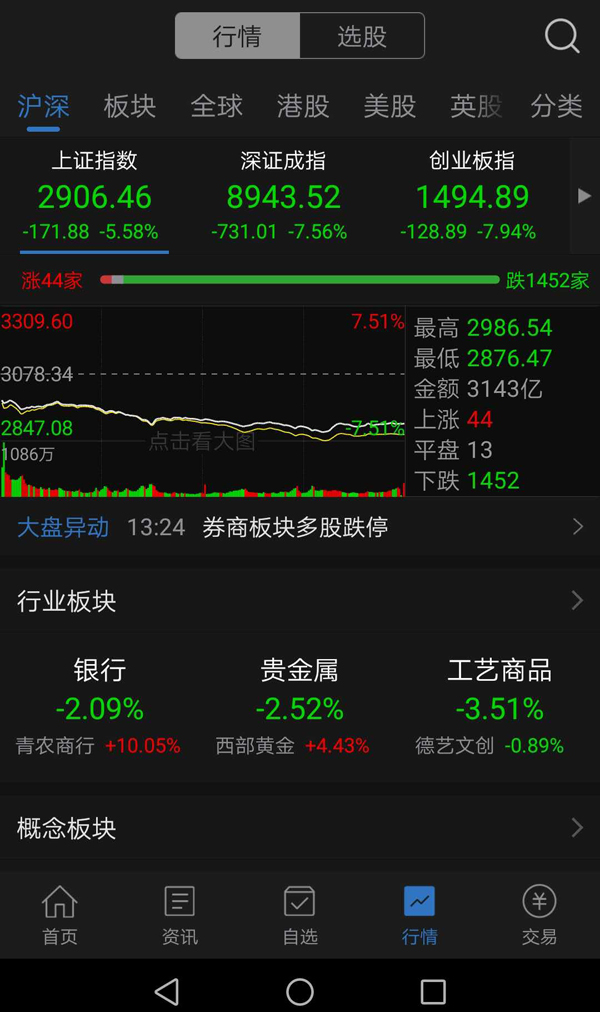 【香港商报网讯】A股今日遭遇五月开门黑,三大股指收盘全线重挫,其中沪指下跌5.58%,退守2900点整数关口,收报2906.46点;深成指下跌7.56%,收报8943.52点;创业板指下跌7.94%,失守1500点整数关口,收报1494.89点。两市合计成交6579亿元,行业板块全线下挫,两市上千只股票跌停。