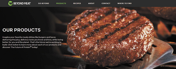 世界首隻人造肉概念股Beyond Meat官網首頁。