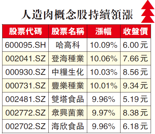 東方財富Choice數據信息顯示,截至5月8日收盤,A股市場人造肉概念股的17家上市公司中,除了1家下跌、1家平盤外,其餘15家均上漲,其中豐樂種業、登海種業等10家漲停,哈高科漲幅最高,達到10.09%。但哈高科和雙塔食品在內的多家上市公司均否認涉及「人造肉」概念。