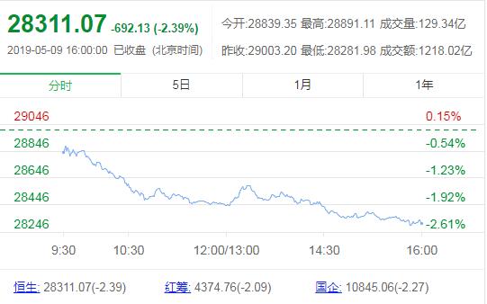 5月9日消息,美股周三收盘涨跌不一,道指微幅收高。投资者正权衡财报、经济数据及货币政策等不确定性因素。今日早盘,港股恒生指数(28311.07, -692.13, -2.39%)低开0.56%,随后跌幅扩大。截至午间收盘,恒指跌2.39%,报28311.07点;国企指数跌2.27%,报11845.06点;红筹指数跌2.09%,报4374.76点。