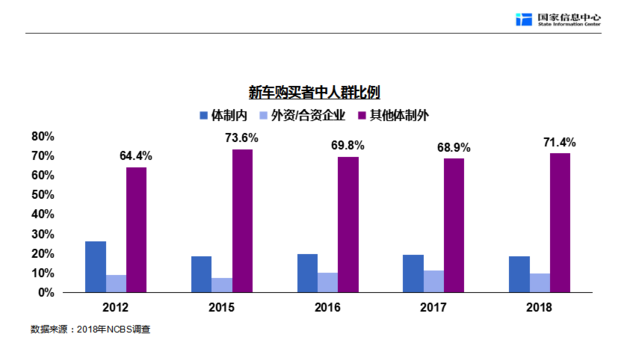 国家信息中心做过一个调研,对16000多个购车人员做了调查分析。他们把购车人群分为三类,第一类是在政府机关、事业单位、国有企业工作的体制内人士,他们在购车人群中的占比是20%,而2012年的数据是30%;第二类购车人群是在合资公司和外资公司工作的人,他们的占比为8%左右;除此之外的人群,主要是一些个体工商户或者在各种形式的民营企业工作的人,占比为72%。